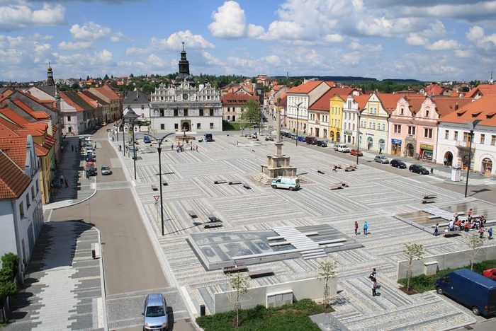 Kronikář Václav Hájek z Libočan v Kronice české uvádí, že město Stříbro založil roku 1131 český kníže Soběslav I. Těžba stříbra vedla k rychlému rozvoji sídla, které Přemysl Otakar II. v roce 1263 povýšil na město a opatřil je značnými privilegii, která městu potvrdili i další panovníci. Jádro města je semknuto do kruhu, jehož pomyslným středem je budova renesanční radnice. Část dlážděné plochy vodního parteru v jihovýchodním rohu náměstí tvoří mozaika fasády dnes již neexistujícího minoritského kláštera. V trase původní významné středověké evropské kupecké stezky je do dlažby vložena „stříbrná brož - kilometrovník“. Pískovcová kašna před radnicí je zachována v původním místě. Na východní straně náměstí vytváří stříhaná alej platanů společně s vodními prvky a nově vybudovanou pohledovou stěnou „novou východní frontu“.
