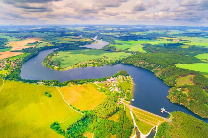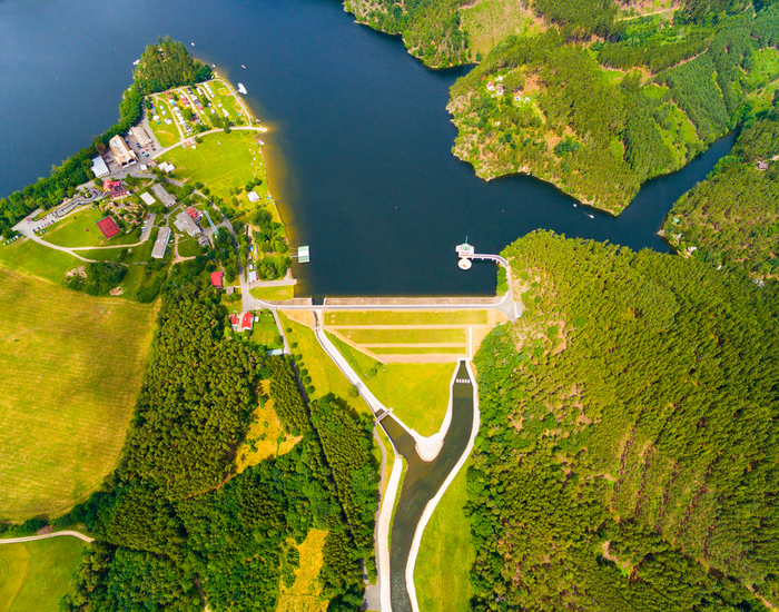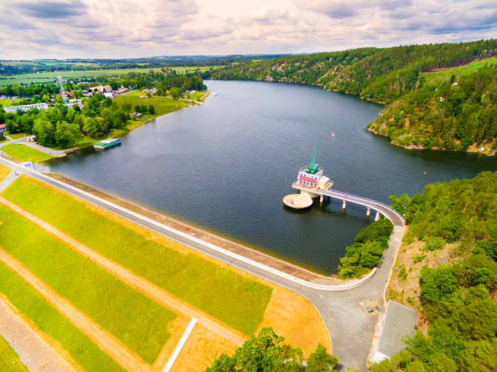Hracholusky je přehradní nádrž o rozloze 490 ha, Celková délka vodního díla od jezu pod parkem ve Stříbře až k hrázi je 22 km. Přes přehradu vedou dva mosty. Jeden železniční a druhý silniční. Železniční most (tzv. Pňovanský most) je ocelový most s volnou výškou 37 m stojící na dvou samostatných kamenných pilířích, po němž vede trať končící v Bezdružicích. Silniční most je betonová stavba a je pro okolí přehrady významnou dopravní tepnou spojující oba břehy vodního díla.